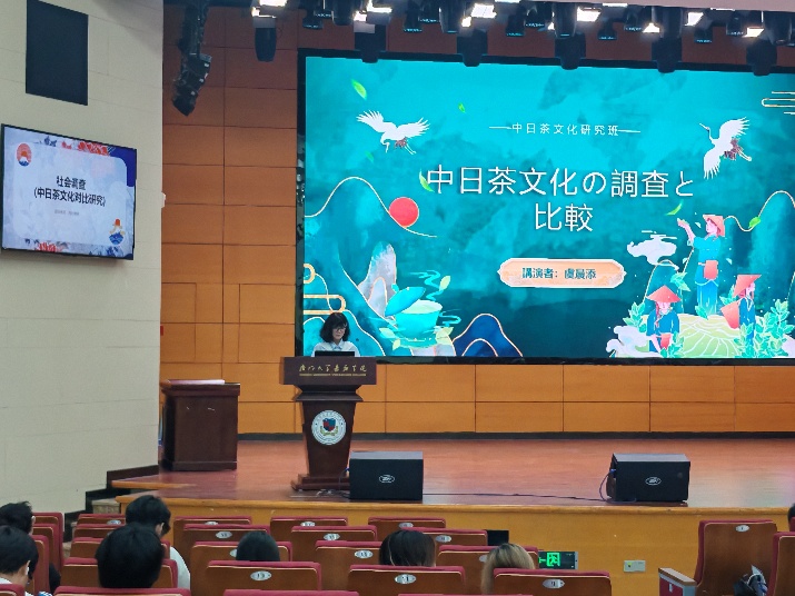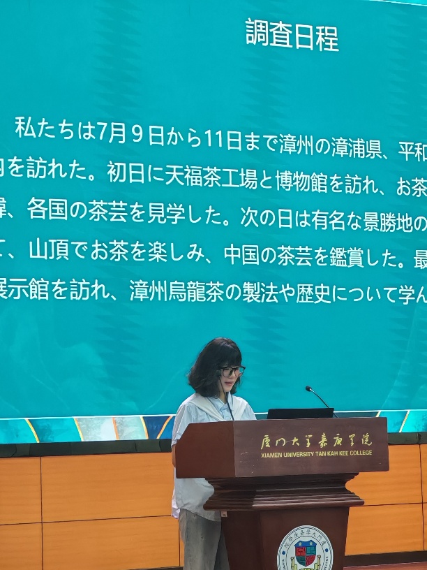 《社会调查(中日茶文化对比研究)》课程项目组由2022级虞晨添负责成果汇报。项目组在西村秀树老师的带领下,前往漳州天福茶博物馆、高峰谷茶园等地实地调研了中国茶文化的发展史。