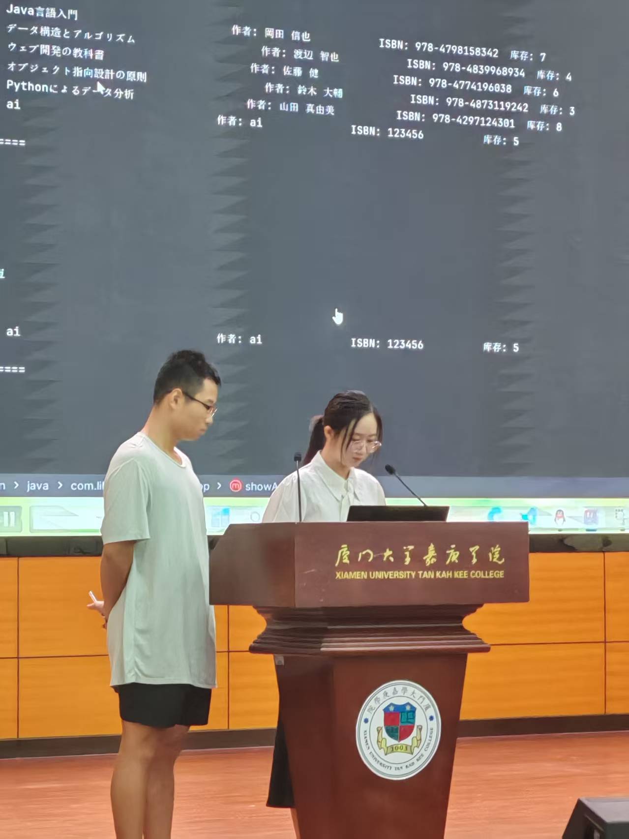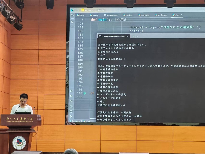 王笑寒老师指导的《程序设计》课程项目组由2023级陈世剑、卢灵丹两位同学负责成果汇报,通过PPT与视频形式详细展示了实践周期间项目组同学们设计的图书管理系统,实现了系统在Python和Java两种编程语言在解决实际问题上的不同运用,展现了同学们逻辑思维与技术应用的能力。