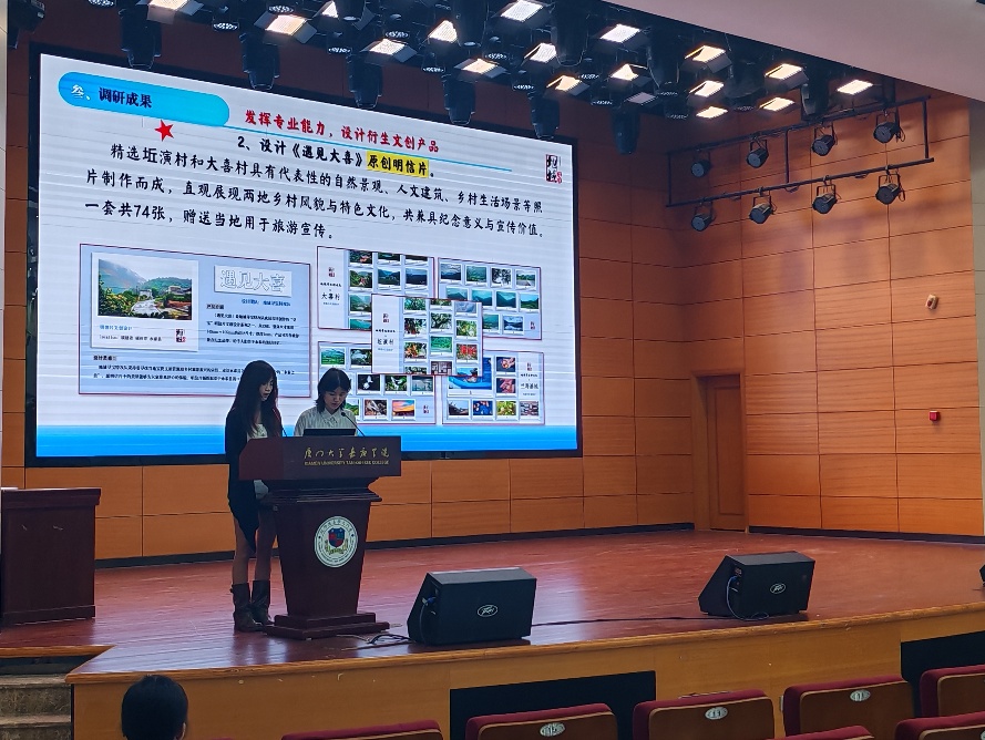 最开始上场的是《社会调查(中日文旅融合对比研究)》课程项目组,由2022级王佳汶、王一心两位同学上台汇报项目组调研成果。