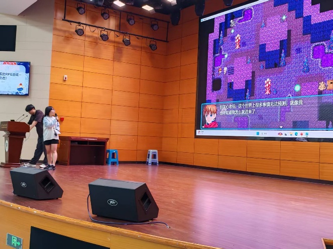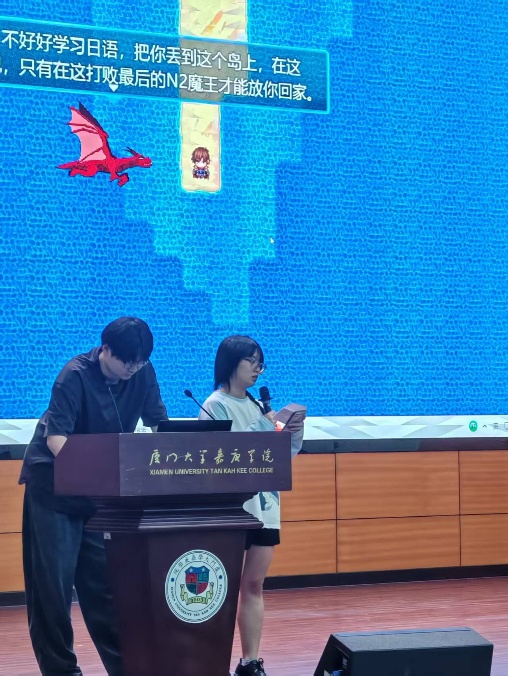 周恒恒老师指导的《基于AI语料库的 RPG 游戏 -- 小嘉物语》项目组由2022级梁馨匀和喻鸿浩同学负责成果汇报。项目组同学在周恒恒老师的指导下设计了一款融合RPG元素与日语学习的小游戏——《小嘉物语》。