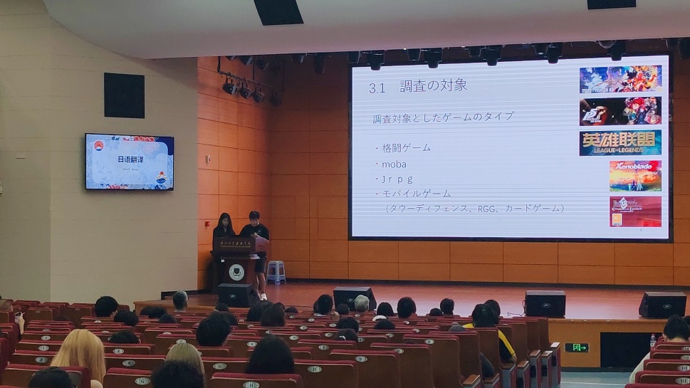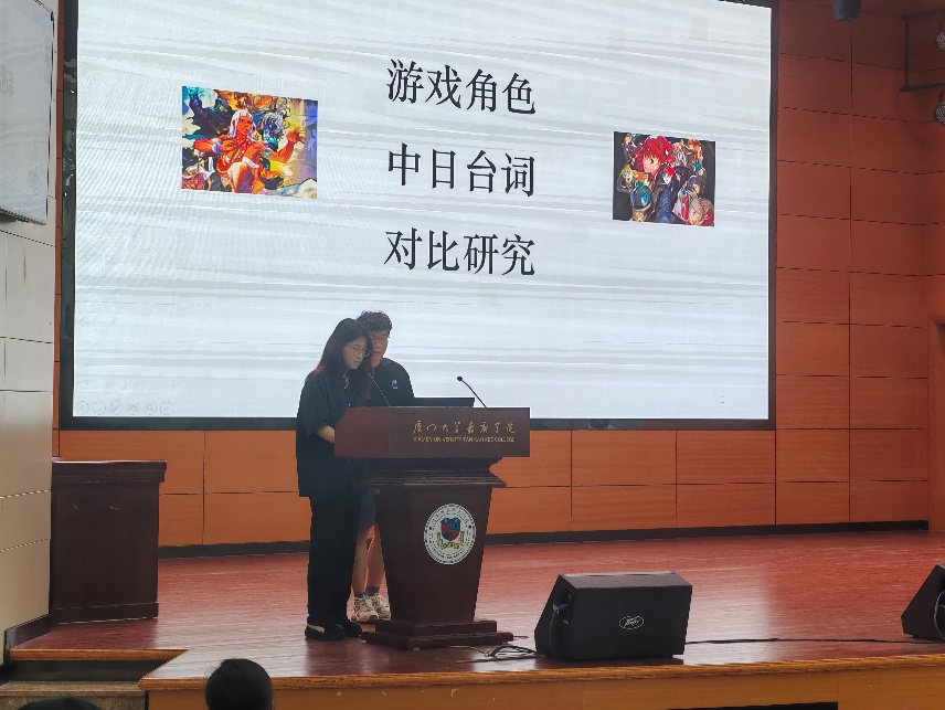 汇报开始,代表项目组汇报的2022级陆昱、金文彬首先介绍了“役割語(やくわりご)”即“角色语言”的概念内涵,阐释“角色语言”在日常生活以及文艺作品中的普遍性。项目组研究发现,游戏角色日语台词的大量 “角色语言” 难寻对应中文,在翻译过程中易失 “角色感”,但可借方言、古语模仿及叙述补充间接传达信息。相信项目组的成果汇报进一步引起了大家对中日语言差异的思考,提醒同学们在中日文翻译过程中要有意识地关注“角色语言”,力求语言翻译的“信、达、雅”。