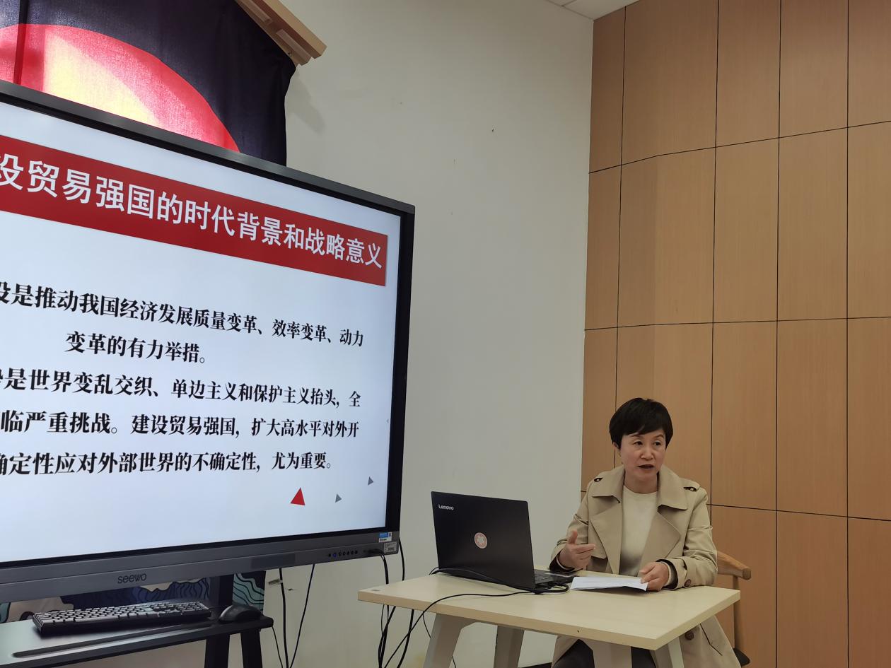 会上,刘莉书记以《学习贯彻二十届四中全会精神,加快建设贸易强国》为题,为全体师生党员作了深入系统的宣讲报告。宣讲中,她结合党的二十届四中全会核心要义,重点解读了加快建设贸易强国的时代背景与战略意义,系统梳理了“十四五”时期中国外贸在复杂严峻的国内外环境中砥砺奋进、稳步前行,为贸易强国建设筑牢根基的发展成就,并围绕“十五五”时期贸易强国建设的重点任务,对全面推进贸易强国建设的实践路径与发展方向进行了清晰展望。整场宣讲内容翔实、逻辑严谨、阐释透彻,有效帮助师生党员深化了对二十届四中全会精神的理解把握,明晰了贸易强国建设的核心要义和实践要求。