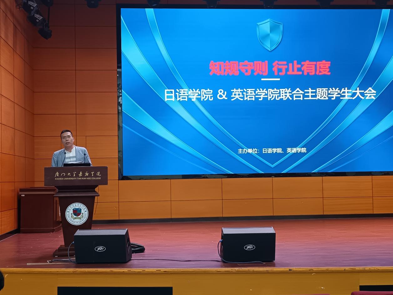 为全面强化学生安全防范意识,规范日常行为准则,筑牢校园安全防线,4 2 日中午,日本语言与文化学院、英语语言文化学院于公共教学楼 1 号楼 101 教室,联合召开 “知规守则,行止有度”主题学生大会。